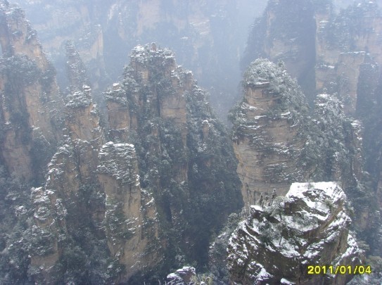 接下来的几天便是兴致盎然的游览。袁家界、天子山、十里画廊……张家界的山是世界上罕见的石英砂岩峰林,一路上,随处可见一座座清瘦孤立的山峰,拔地而起,直冲云霄。恰逢大雪,所见之处皆银装素裹,云雾缭绕,仿佛画中仙境一般。